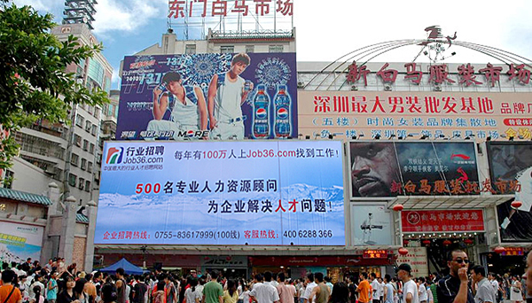 媒体位置:深圳市东门新白马服装市场 媒体形式:楼面大牌 媒体规格:24m(宽) X 10m(高)=240平方米 制作形式:电脑喷绘,夜间照明 媒体现况:Job36行业招聘 车/人流量:人流量:100万/日 曾服务客户:adidas