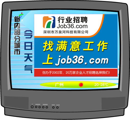 Job36行业招聘携手广东地区最具影响力的电视媒体——广东电视台,在该台公共频道的黄金时段投放天气预报广告,每天四档(19:45、02:20、10:00、14:20)连续播放,4个月累积计播放480次,共2400秒,辐射华南地区上亿的电视观众。
